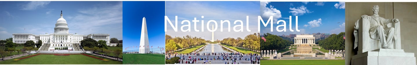 El National Mall es un icónico parque paisajístico y el corazón cívico de Washington D.C., que alberga muchos de los monumentos, museos y edificios gubernamentales más importantes de Estados Unidos. Se extiende por aproximadamente 4 kilómetros (2.5 millas) desde el Capitolio de los Estados Unidos en el este hasta el Monumento a Lincoln en el oeste.